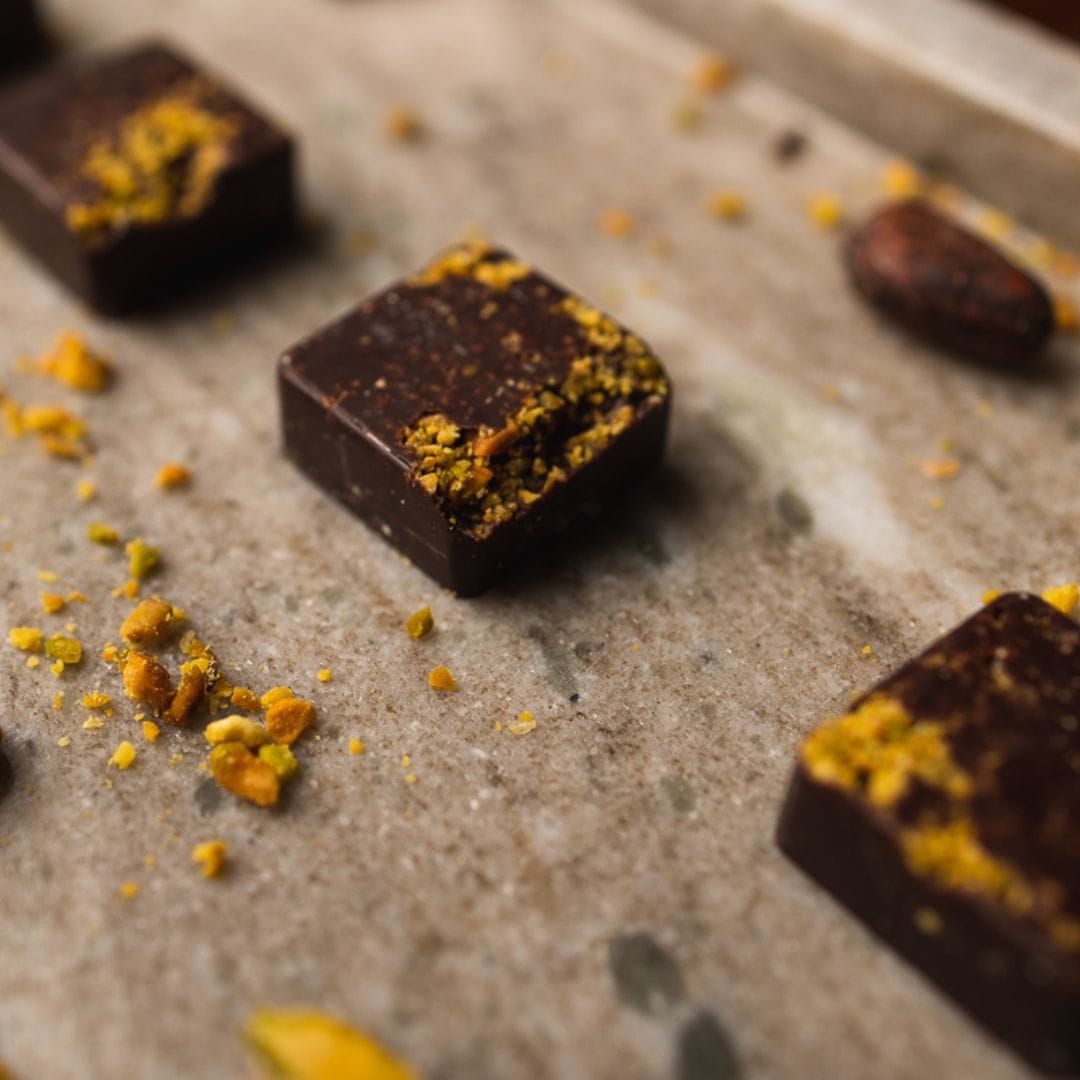 Realizată manual din ciocolată artizanală bean-to-bar 70% cacao, amestecată cu fistic proaspăt prăjit și un praf de sare de mare, oferă o experiență rafinată, echilibrată și memorabilă.
